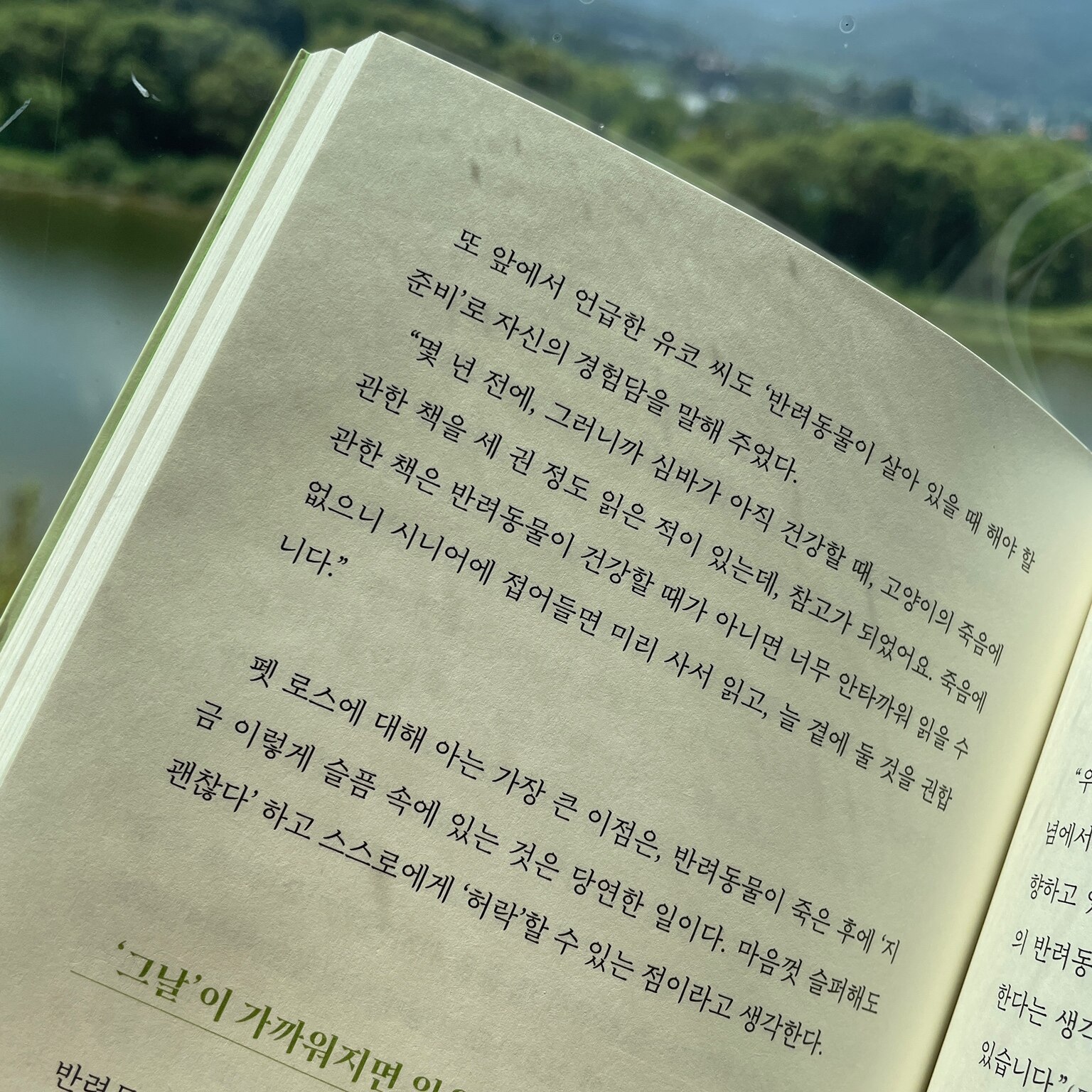 “펫 로스에 대해 아는 가장 큰 이점은, 반려동물이 죽은 후에 '지금 이렇게 슬픔 속에 있는 것은 당연한 일이다. 마음껏 슬퍼해도 괜찮다' 하고 스스로에게 '허락'할 수 있는 점이라고 생각한다” (본문 중 발췌)
