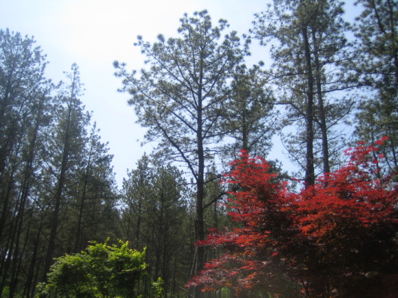 푸른 소나무와 붉은 단풍나무가 서로 자기의 자리를 지키고 있었습니다.