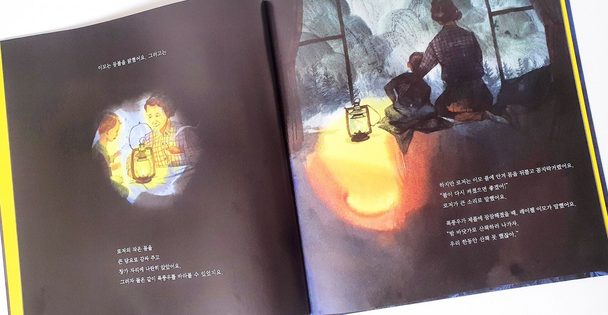 빛이 없고 모든것이 조용한 밤에 로저와 이모는 함께 귀 기울이며 부엉이와 개구리, 귀뚜라미와 여치의 울음소리가 밴드의 연주소리처럼 들린다. 그소리가 얼마나 아름답고 좋을지 상상이 되어 미소가 짓게 되었다.