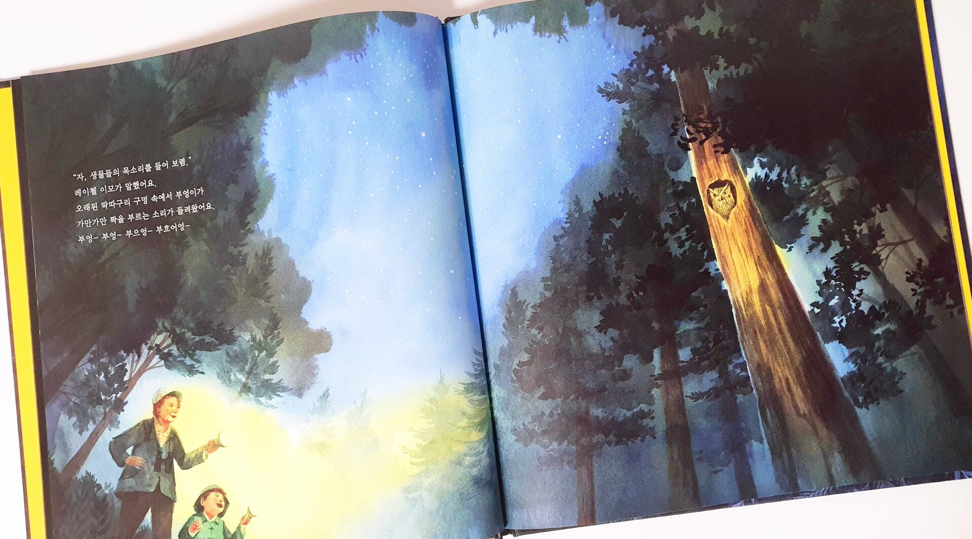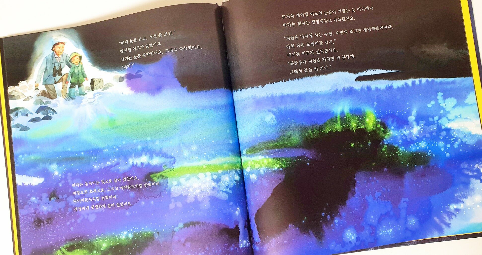 그렇게 숲에서 들려주는 음악소리와 함께 바닷가에 도착한다. 그리고 바다의 움직임을 바다의 소리를 듣는다. 아무도 없고, 불빛조차 없는 조용한 바닷가에서 귀를 기울이는 레이첼 이모와 로저처럼 나도 아이와 함께 자연이 들려주는 소리를 듣고 싶어졌다.