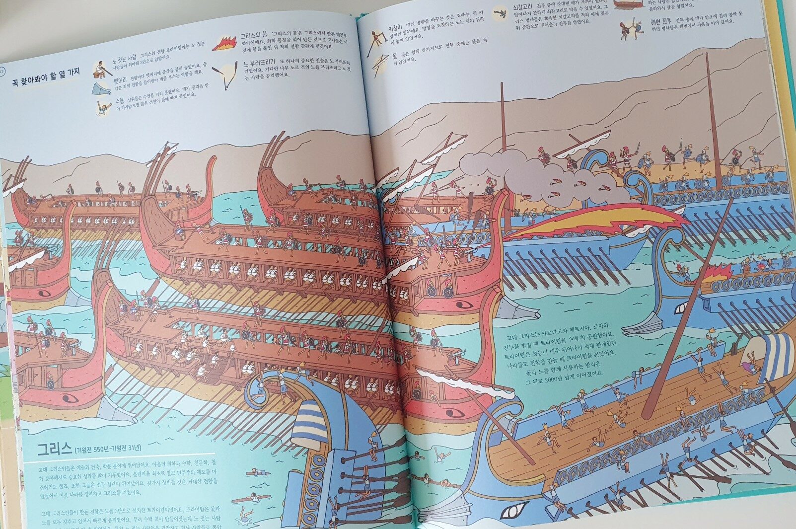 예술과 건축, 학문 분야에 뛰어난 그리스를 알아봤다. 지금도 하고 있는 올림픽이 최초 열리고, 민주주의 제도도 마련되었고, 전함에 노 젓는 사람이 각각 180명씩이 탈수 있었다니 얼마나 큰 전함이었는지 가늠할수 있어서 더 놀랐던거 같다. 그리스에 대해 많이 알지 못했는데 책을 보면서 그리스에 관심을 가지게 되었고, 노 부러뜨리기가 전술 중 하나라는것과 전투중 돛을 펴지 않았고, 선원들은 수영을 거의 하지 않았다는것을 "꼭 찾아봐야 할 열가지"를 찾으면서 아이가 모르는 알지 못했던것을 그림을 찾아보면서 알아가는게 좋았다.