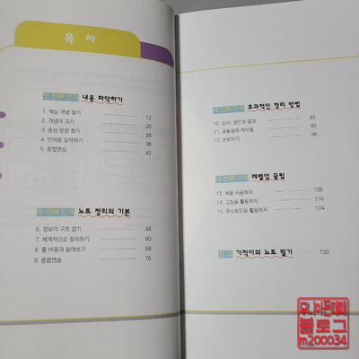 1. 핵심 개념 찾기, 2. 노트 정리의 기본, 3. 효과적인 정리 방법, 4. 레벨 업 꿀 팁으로 책은 크게 4가지로 구성되어 있어요.
