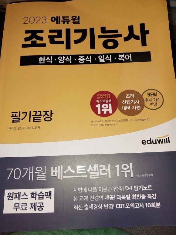 조리 기능사를 취득하고자 하는 이들에게 <2023 에듀윌 조리기능사>는 조리기능사 필기 책으로 추천하고 싶다. 한 권으로 책으로 조리 기능사에 대한 필기의 끝판왕이었다.