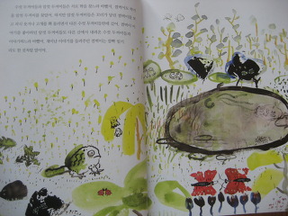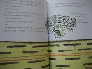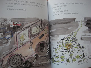 껌벅이의 이야기를 들은 두꺼비들은 용기를 내어 산으로 가는 길목을 건넙니다.