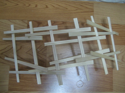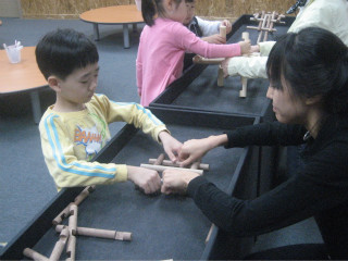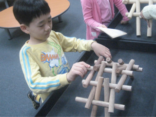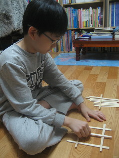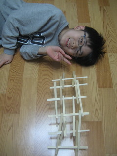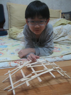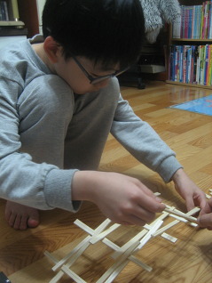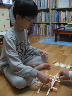 아빠의 도움을 받아 열심히 레오나르도 다빈치 이동식 교량을 만드는 아이...