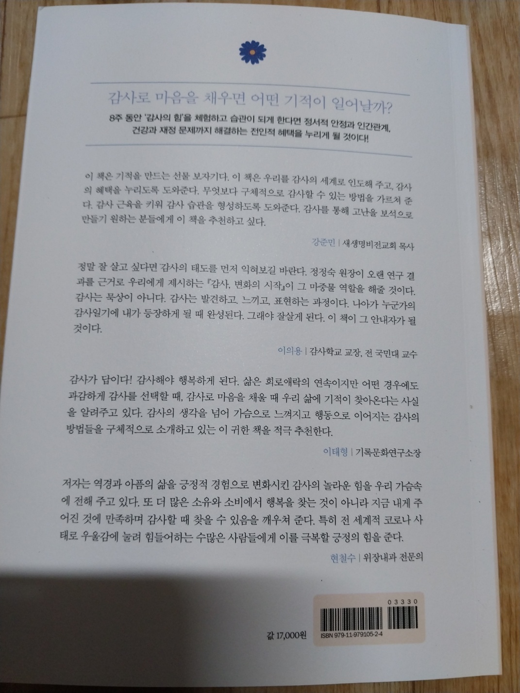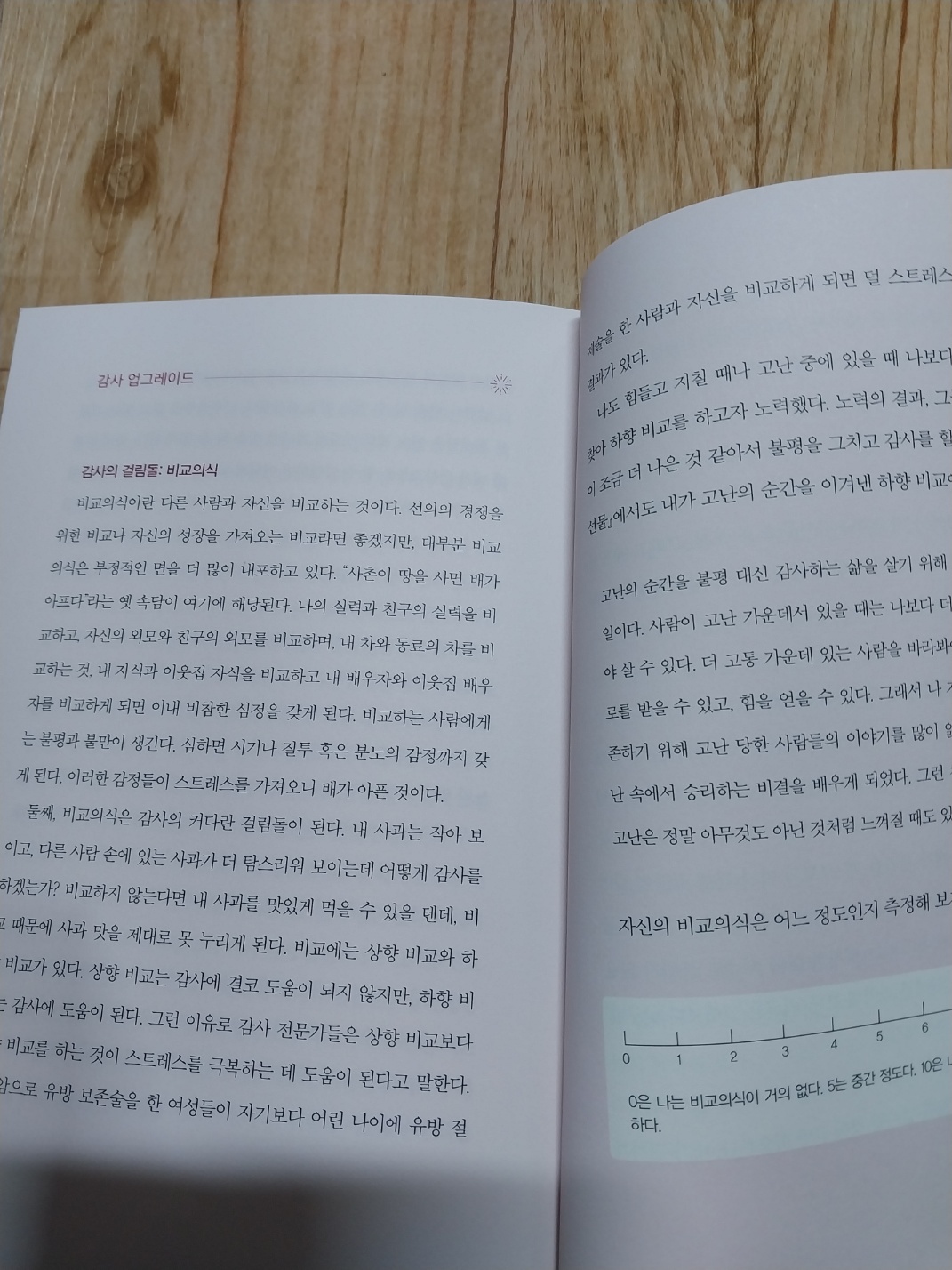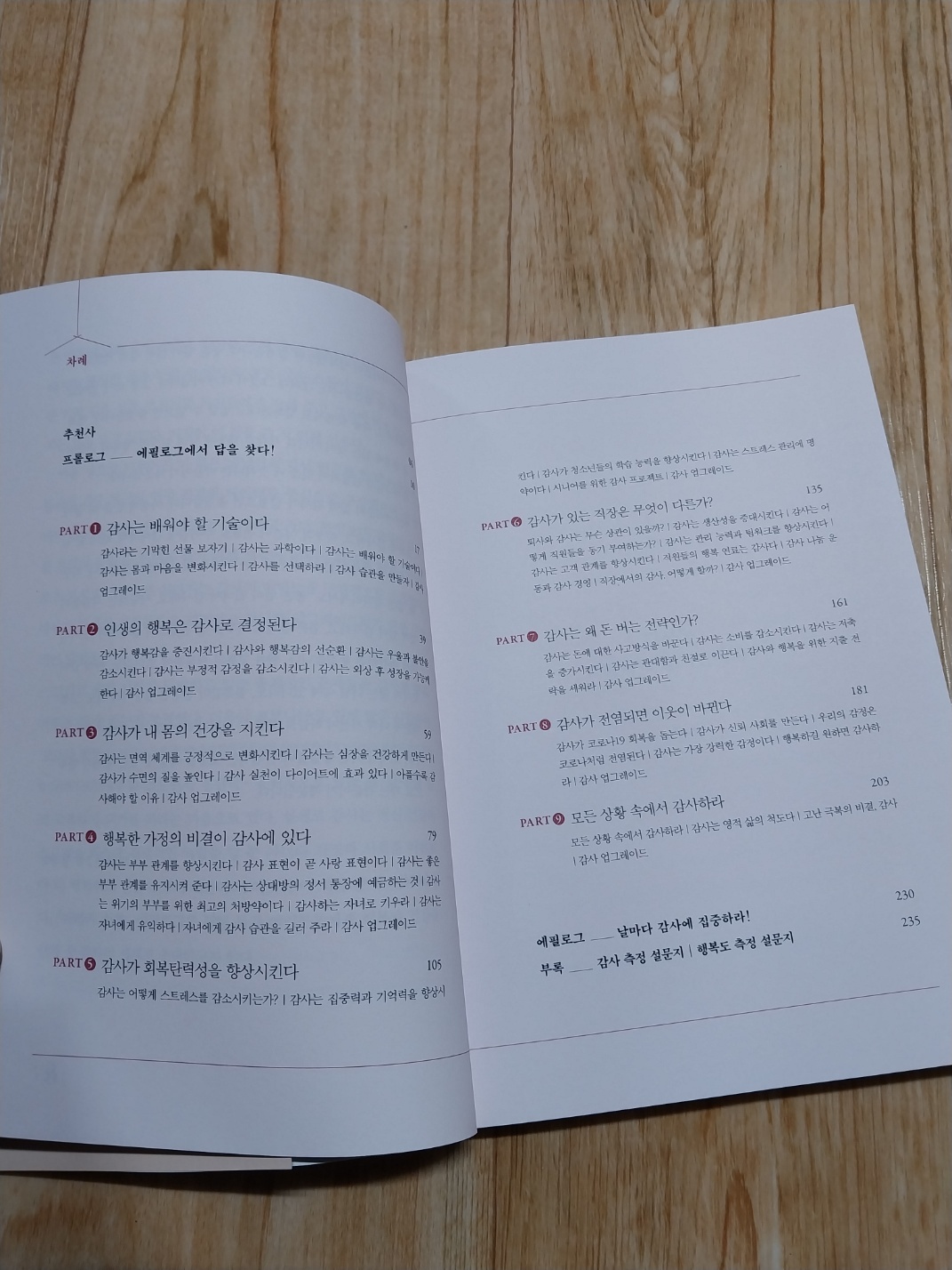 살아가면서 감사하는 마음은 언제 어디서나 가득한것 같다.평상시에도 감사의 중요성을 인식하며 살았지만 이 책을 읽고나서는더욱 크게 다가왔다. 감사의 기적이란 말이 딱 맞다고 느껴졌다.감사에 대해 연구할 가치가 엄청 크다는걸 알게 되었다.작가의 말처럼 인생의 터닝 포인트를 만들어 주는 것 같다.파트1에서 9까지 감사에 대해 자세히 설명해 주고 있다.살아가면서 감사로 인해 얼마나 많은 것을 얻게 되고 행복해 질 수 있는지 알게 되었다.매사에 당연시 여기기 보다는 작은것에서 부터 감사하고 그 감사의 표현으로 인해 모두가 행복해 질 수 있다는걸 알게 해주는 것 같다.감사로 인해 마음이 편안해 지고 몸도 건강해 질 수 있으며 가장 작은 사회인 가정에서도행복을 누릴수가 있다는걸 새삼 깨닫게 해준다. 감사하는 말한마디에 내 마음도 기쁘고 상대도한결 기분 좋아지는 상태가 되니 이 얼마나 좋은 일인지?돈을 벌려고 아둥바둥하는것 보다 감사의 생활화가 더 큰 돈을 벌수 있다는걸 깨닫고 스스로 부끄러워 지는걸 느낀다. 그동안 왜 감사라는 걸 모르고 메마른 삶을 살아왔는지 안타깝기만 하다.이책을 통해 감사하는 것이 얼마나 크고 소중한 것인지 알게 되었다. 저자에게 큰 감사를 드린다.이 책을 통해 모든 생활속에서 감사를 생활화 하고 스스로 반성하며 낮은 삶을 살려한다.작은 것에서 아주 큰 행복을 얻을 수 있을 것같다.감사 업그레이드편을 통해 감사에 대한 실천을 배울 수 있게 되어 참 좋은 것같다.뿐만 아니라 부록으로 감사 측정 설문지와 행복도 측정 설문지를 통해 나 스스로에 대해 평가해 볼 수 있어 참 좋았다.두번 체크를 해보았는데 기간이 짧아서 인지 점수 차이가 그리 많지는 않았다.아직 감사의 실천이 제대로 되지 않았고 감사의 기술을 제대로 습득하지 못했기 때문인것 같다.이제부터 감사로 마음을 채우고 나에게도 어떤 기적이 일어날지 기대해보련다.서서히 작은 변화가 일어나길 바란다. 내 삶의 행복을 위해서 작은 실천을 해보련다.많은 분들이 평가한것 처럼 감사를 통해 보다 좋은 보다 나은 삶을 살게 해주는 고마운 책이다.#출판사로 부터 북뉴스를 통해 무료로 제공받아 개인적 견해로 작성되었습니다