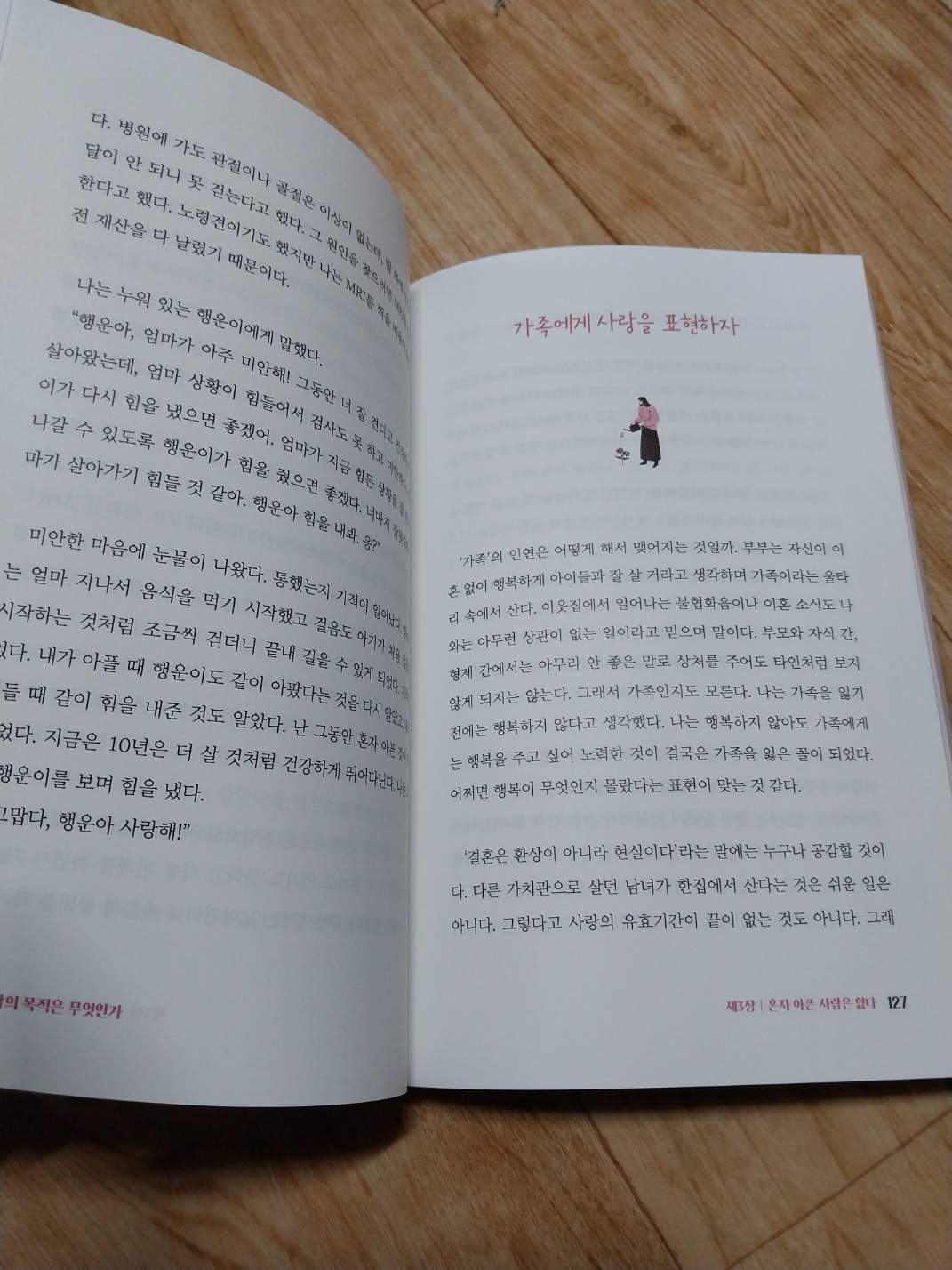 살아가면서 삶의 무게가 무겁게 느껴질 때가 있다 . 작년에 많이 심했고 올해들어 요즘에도 그런것 같다. 어떤때는 회의가 느껴지기도 하고 나만 불행한 것같이 느껴질 때가 있다.그럴때면 우울해지기도 하고 마음도 많이 복잡해 진다. 과연 지금 이대로 살아도 되는 걸까?어떻게 살아야 후회없는 삶을 사는 것일까? 고민에 고민을 거듭하기도 한다.희망이 보이지 않을 때가 있었고 이대로 주저앉고 싶을때도 있었던것 같다. 하지만 권은겸님의 책을 읽고 많이 힘이 되었다.자신의 경험을 그녀의 삶을 통해 잔잔한 교훈을 주고 있다. 어쩌면 자신의 생활을 드러내면서 까지 우리들에게 조언을 해주고 있다.나에게도 많은 위로가 되어 주었다. 가슴 따뜨한 느낌을 받게 해주는 책이었다.권은겸 작가님의 말처럼 희망과 감동을 주는 사랑 가득한 작가란 말에 공감한다. 장애를 극복하고 자신의 삶을 묵묵히 받아들이는 모습이 참 좋다. 누군가를 원망하고 미워하기 보다는 이해하고 감사하는 마음으로 살아가는 작가의 삶이 참 아릅답게 느껴진다. 타인과의 비교가 불행의 시작이라고 말하는 작가의 말에 무척 공감한다.예전엔 나 역시도 타인과 비교하며 불평불만 가득한 삶을 살았던것 같다. 그게 바로 불행의 씨앗이자 괴로움의 연속이었던것 같다. 나는 나대로 솔직하게 떳떳하게 살면 되는 것을 왜 남의 삶과 비교하며 흉내내려 했는지살짝 부끄러워 진다. 나 자신을 사랑하고 존중해야 한다는건 참 중요한 것같다. 내가 나를 소중히 여기고 존중해야남들도 나를 존중한다는 건 예전부터 많이 들어왔다. 작가 김은겸도 자신의 장애와 힘든삶앞에서 좌절했지만 큰오빠의 삶을 통해 깨닫을 수 있었다.내가 나를 존중하면 타인도 나를 존중 한다는 것을 ......나 역시도 결혼에 대한 환상이 있었던것 같다. 하지만 혹독한 현실이었다.그렇다보니 자연 아이들에게 소홀해지고 화풀이 대상으로 삼았던 것도 사실이었다. 그러다 보니 소통도 잘 하지 않고 대면대면 살아왔던것 같다.아이들이 성인이 되면서 그래도 관계가 좀 나아진것 같아 다행이란 생각이 든다.작가는 말한다. 사랑은 표현이라고. 아무리 좋은 사랑도 표현하지 않으면 모른다고.앞으론 우리 가족에게 사랑을 표현하련다. 내 마음을 아이들이 알 수 있도록 표현하며 좀더 가까이 가고자 노력하련다.작가의 삶을 통해 많은 걸 배우고 위로를 받았다.작가의 글을 읽으며 공감가는 부분이 참 많았던것 같다.내 삶의 오류를 많이 발견한것 같다.이 책을 통해 내 삶이 긍정적으로 바뀌고 힘을 얻게 되어 감사드린다.이글은 북뉴를 통해 출판사로부터 무료로 제공받아 개인적 견해로 작성 되었습니다.#내삶의 목적은 무었인가 #권은겸 # 두드림미디어 #북뉴스 #서평단