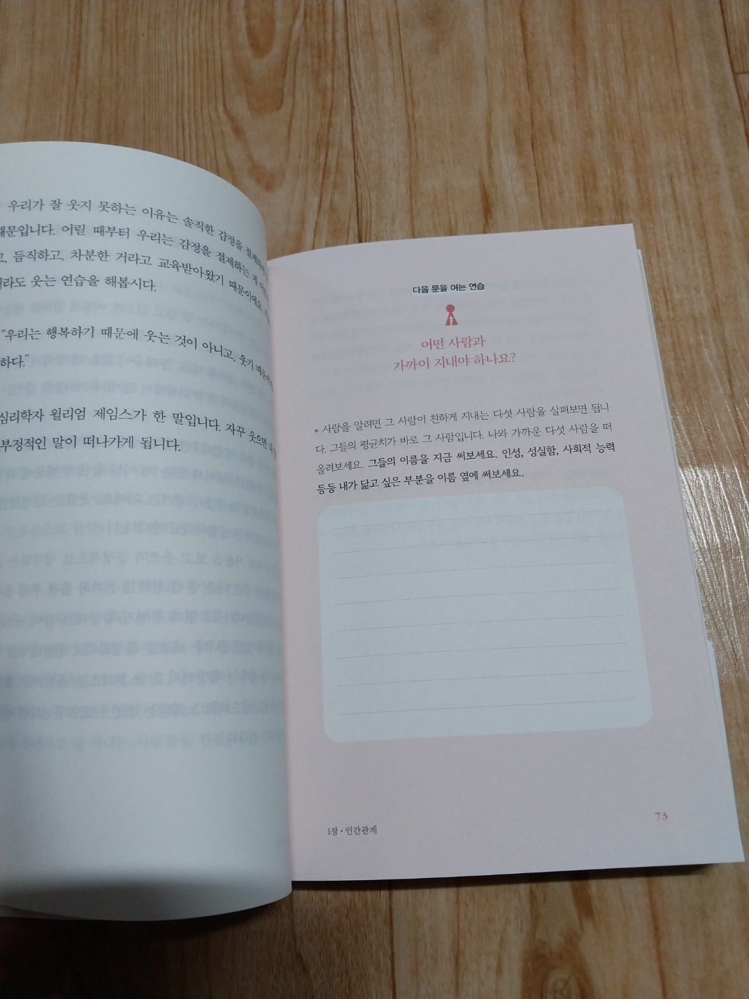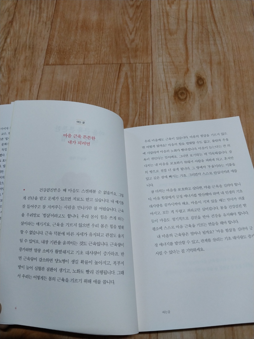운동해서 내 육체의 근육만 키운다고 생각했지 마음에도 근육이 있다는 말에 의아함 마저 들었다.사람의 심리를 안다는 것은 참으로 알다가도 모르게 어려운것 같다.사람의 마음이 가장 복잡한게 아닐까 생각해 본다.난 항상 마음이 여려 상처를 많이 받는 사람 가운데 하나라고 생각한다.남들이 생각할 때 아무것도 아닌것처럼 느낄지 모르겠지만 나에겐 엄청난 상처로 돌아와 힘들때가 참 많았다. 언젠가는 눈물을 많이 흘린때도 있었다.어쩌면 내 마음 근육이 단단하지 못하고 약해서 그랬던것 같다.이 책을 통해 내 마음 근육도 튼튼하게 다지게 되었다.박상미 심리상담가는 이미 얼굴을 알고 있기에 참 반가웠다.내가 즐겨 시청하던 속풀이쇼 동치미와 아침마당이란 프로에서 보았기 때문이다.이분의 말씀을 종종 들어왔기에 더 좋았고 더 공감할 수 있었던 것 같다.하는 이야기마다 그래 맞아 라고 고개를 끄덕였던 기억이 떠오른다.그랬던 분의 글을 이렇게 책으로 만나게 되어 참으로 감사하다.많은 도움을 얻을 수 있었다. 새로운 나로 거듭난 느낌마저 든다.나도 이제 스스로 마음 근육을 기르는 연습을 해보고자 한다.내 감정을 스스로 자각할 줄 알아야 내 감정의 주인이 될 수 있다고 했다. 지금까지 난 그렇지 못하고 살아온 것 같다. 온통 남의 탓으로 돌렸기에 후회가 많았던것 같다.미안하다고 사과하는 것에도 서툴고 감정 조절을 제대로 하지 못했다는걸 깨닫게 되었다.우리 나라 사람들이 많이 쓰는 어휘를 보니 긍정적인 감정보다는 부정적인 감정의 어휘를 많이 사용한것 같은 느낌이 든다. 내 마음의 상태를 알려주는것 같아 좀 씁쓸함을 느꼈다.앞으론 마음을 다잡고 보다 긍정적인 마인드로 살아야 겠다.만족이나 기쁨과 같은 긍정적 감정의 어휘를 사용해야 겠다는 다짐을 가지게 되었다.행복과 불행은 생각하는 습관대로 된다는 말이 무척 마음에 와닿는다.내 스스로 행복해지기 위해서는 생각부터 바꿔야 한다는 걸 알게 해준 책이었다.박상미의 고민 상담실을 통해 나를 다시한번 더 생각할 수 있는 계기가 되었고마음의 응어리도 풀 수 있었으며 새로운 다짐을 하며 나를 다지는 좋은 기회였다.마음 근육 튼튼한 내가 되는법 필사 노트가 있어 내게 많은 도움이 되었다.내마음의 상처에 대한 치유도 되었으며 마음 근육 또한 벌써부터 많이 커진 느낌이다.이글은 출판사로 부터 북뉴스를 통해 무상으로 제공받아 개인적 견해로 작성 되었습니다#마음 근육 튼튼한 내가 되는 법 #특별한 서재 #박상미 #북뉴스 #