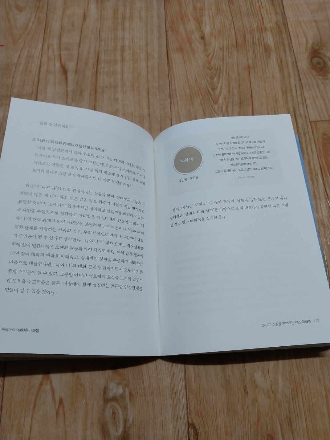 우리가 살아가면서 눈 뜨면서 부터 감을 때 까지 항상 말을 하며 사는것 같다. 하지만 항상 사용하는 이 말에도 품격이 있고 때와 장소에 따라 그에 걸맞는 말이 있다. 그에 따라 적절하게 말을 할 줄 알아야 하고 표현법도 각양각색이라 한마디 한마디에 신중을 기해야 한다. 말하기 전에 생각 한번 더 하고 한다면 인간관계에서도 좋은 결과를 가져올 것이다.옛말에 말 한마디에 천냥빛을 갚는다고 했듯이 말의 소중함은 강조하고 또 강조해도 지나치지 않는것 같다.우리가 사회에서 보면 아무리 실력이 뛰어나더라도 주변의 관계를 잘 못하고 있는 사람들이 참 많은것 같다. 아무리 다재다능 하다고 해도 주변과 제대로 소통하지 못한다면 무슨 소용이 있겠는가? 어쩔 수 없이 사회에 적응하지 못하고 외톨이 신세로 전락하고 말것이다. 나 역시도 항상 대화에서 남들보다 못하다는 느낌을 받을 때가 많았던것 같다. 그래서 잘 어울리지 못한거 같다. 하지만 이 책을 통해서 대화의 기법을 많이 알게 되었다. 나의 문제점이 그대로 이 책에서 보여주고 있는것 같은 느낌이었다. 특히 대화의 예문을 통해 문제의 대화와 좋은 대화의 차이를 쉽게 이해 할 수 있었다. 특히나 사회 초년생에게는 많은 도움이 될것 같아 꼭 추천해주고 싶다.챕터7의 상황을 파악하는 센스 대화법에서 많은걸 배우게 되었다. 나에게 부족한 점이 바로 이거였던 것 같았다. 그동안 내 얘기 위주로 나만 생각하고 대화라기보다는 그저 나 혼자 떠들기만 했다고 할까? 하지만 이젠 이책을 통해 배울 수 있었다. 상황과 서로의 입장에 따라 서로의 관계에 따라 달리하는 대화법을, 즉 상대적 대화 성향을 바탕으로 유형에 따라 상황별 센스있는 대화법을 배우는 좋은 기회가 되었다. 한때는 대화를 잘 하는 사람들을 보면 일종의 타고난 재능이라 생각했었다. 그러나 이책을 읽으면서 느낀건 대화도 꾸준한 노력과 습득을 통해 얼마든지 향상 시킬 수 있다든 걸 알게 되었다. 읽고 나서 사회 초년생이 된 우리 두 아이들에게도 읽기를 권장해 주었다.대화에서 중요한게 남의 말을 잘 듣는 것이 얼마나 중요한지 알게 해 준 책이었다. 나 위주의 말만 하지말고 상대방을 배려하며 존중하는 마음으로 경청해야 효과적인 대화를 유지 할 수 있는 것이었다. 귀 기울여 경청하는 일은 사람의 마음을 얻는 최고의 지혜라는 말이 있듯이 경청이 얼마나 중요한지 다시 한번 깨닫게 되었다. 사회생활에서 꼭 필요한 소중한 대화법을 잘 배우게 해준 책이었다. 출판사로 부터 북뉴스를 통해 무료로 도서를 제공받아 개인적 견해로 작성 되었습니다#똑똑한 대화법 #북인사이트 #최지혜 #배원진 #북뉴스 #일잘러의 직장 소통법