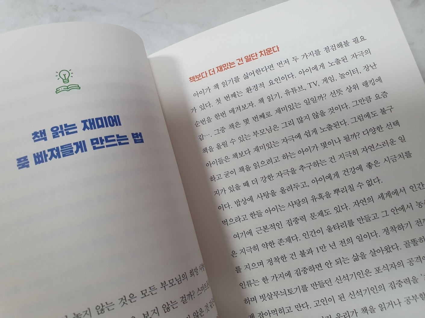 물론, 미디어 노출이 나쁜 건 아닙니다. 단, 그 미디어 노출을 "언제"부터 하는 것이 좋으냐는 것인데, 사실 영상이 더 쉽고 재밌게 느껴지기 때문에 영상에 익숙해지면 책을 멀어질 수 밖에 없어요. 따라서 책 읽는 습관을 잡은 후, 선택적으로 영상 노출을 하는 것이 순서라 생각합니다. 저도 이 부분에 정말 공감하고 있고, 저 또한 이렇게 실천하려고 노력하고 있어요.