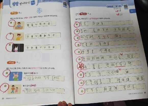 그리고 큐알코드를 찍으면 맞춤법 무료 강의와 받아쓰기의 경우도 받아쓰기 내용을 불러주기때문에 아이 스스로 공부하기에 정말 최적화된 교재인거 같아요.