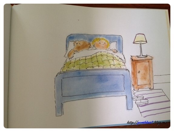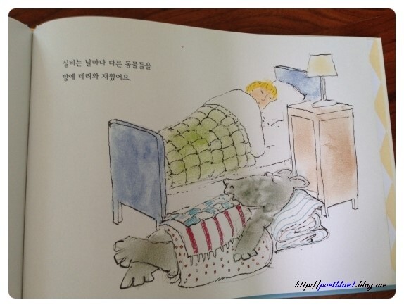 아기 곰과 함께 자신의 침대에서 잠이 들고요.