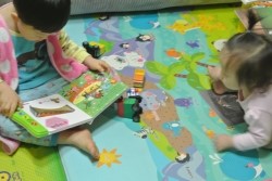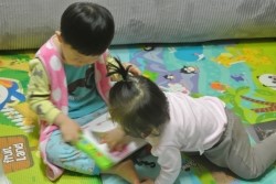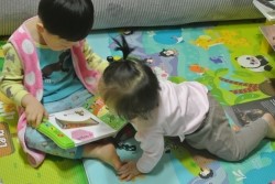 큰아이가 동생에게 책을 읽어주거나 이야기를 들여준다.
