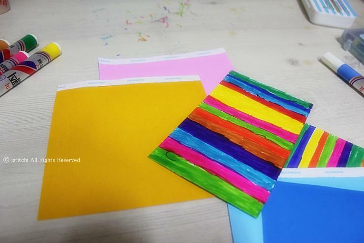 알록달록 예쁘게 색칠한 종이를 세로로 길게 반으로 잘라서