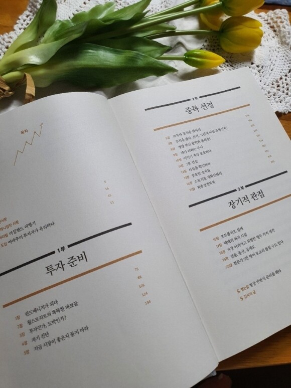 3부로 걸쳐진 투자 준비부터 종목선정 장기적 관점을 내다보며 2부와 3부는 초보인 나에게도 아주 쉽게 읽을 수 있는 주식 투자 성공 요소들을 이야기 해주고 있다지요.