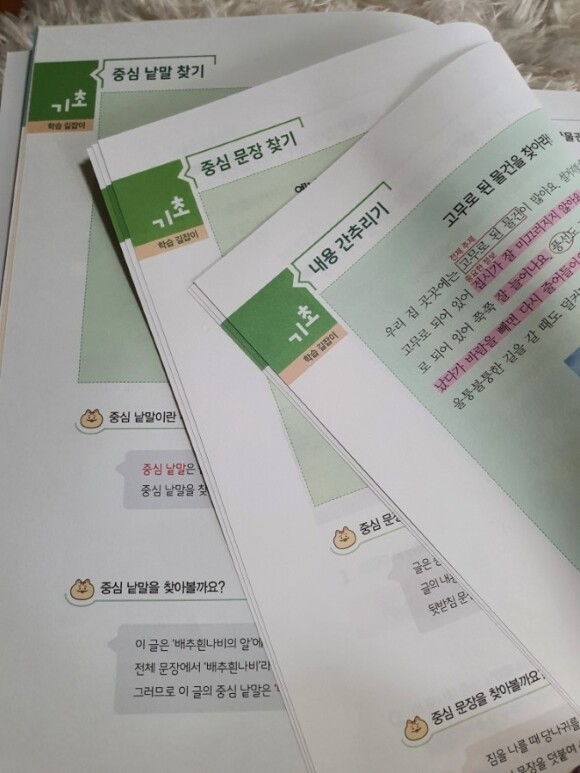 차근히 풀어보면서 기초를 다지며 가장 우선적으로 알고 있어야 할 중심낱말-중심문장-내용간추리기까지 해볼 수 있어요.