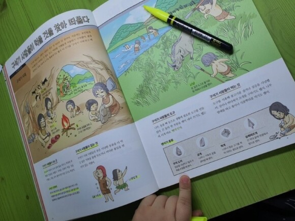 구석기 시대를 함께 펼쳐보면서 하는 말이 뗀석기를 썼다느니, 구석기 시대에는 사람들이 동굴에 살고, 동물의 가죽이나 나뭇잎옷을 입었다고~