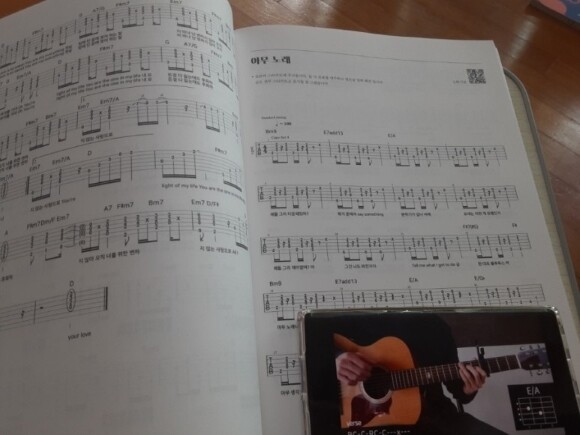 QR코드로 유튜브로 통단기 선생님의 기타 선율에 맞추어, 기타 타보 악보 보며 선생님 기타 코드 잡는 법도 보면서