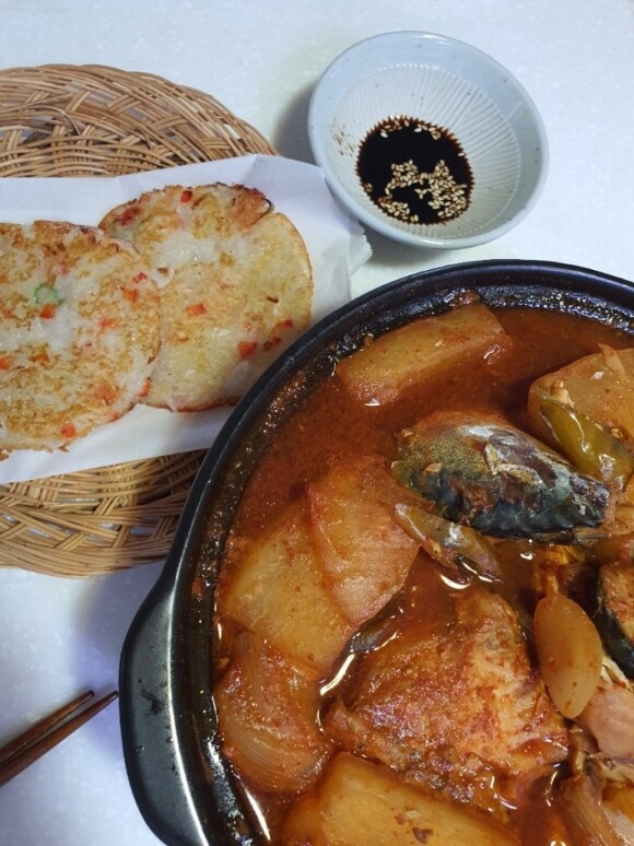 나는 고사이 고등어 사놓은 걸로 무우 나박나박 썰어서 깔고 알토란 비법장으로 고등어 조림 소스로 올려주어 보글보글 끓였다.