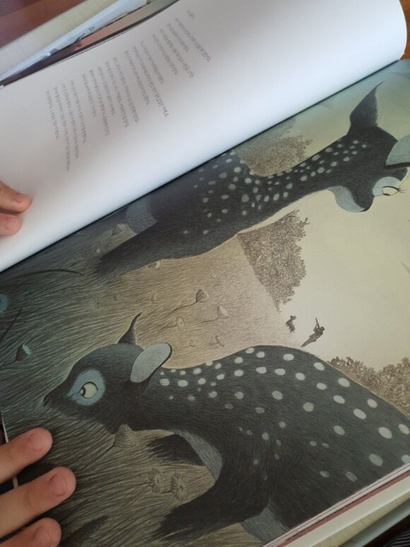 책 속의 밤비 표정과 숲속의 밤비의 심리묘사까지 고스란히 전해지듯 클라이멕스 전율이 흐르는 순간.