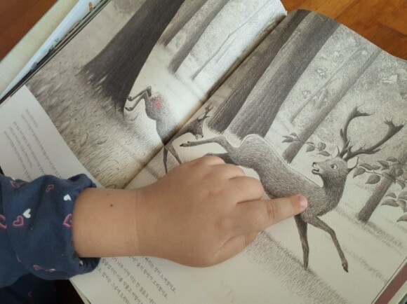 아기 노루 밤비와 엄마, 숲의 왕까지 1인 3역을 하면서 읽는데 어찌나 재미지고, 갸날프고, 이야기 속에 전해지는 숲속의 이야기 정말 빨려들어갈 것 같더라고요.