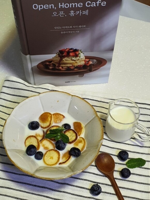 오늘은 우리 아이에게 깔끔한 브런치로 미니 핫케이크와 우유를 곁들인 디저트도 만들어보았답니다.
