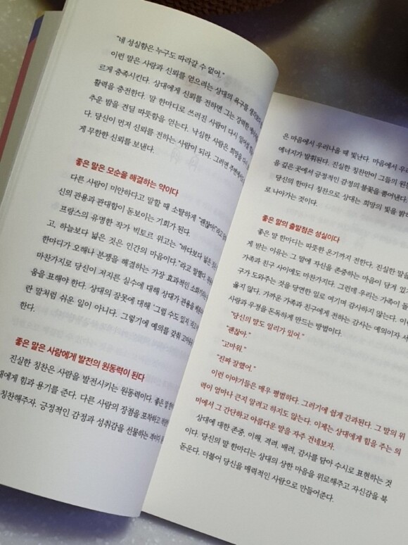 이 책을 통해 대화의 기술을 키워보고, 서툴렀던 감정 표현이나, 상대방을 존중하며 칭찬으로 키우는 능력까지 키울 수 있어서 좋았습니다.