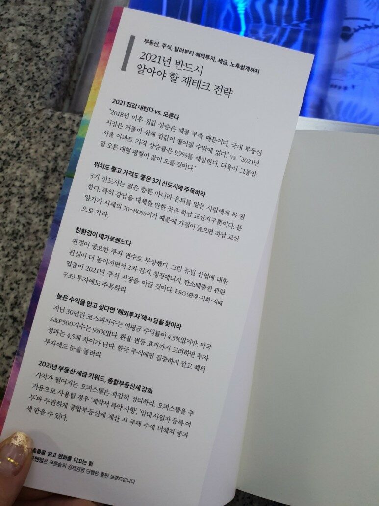 재테크로 깨어있는 내가 되어야겠다는 생각으로 [ 2021대한민국재테크트렌드 ] 책을 펼쳐보게 되었다.