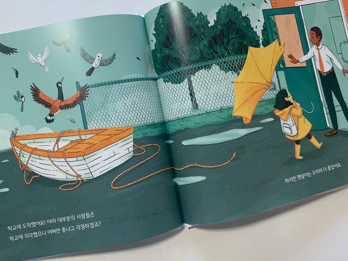 우산쓰기 좋은 날이라며 즐겁게 학교를 가요.