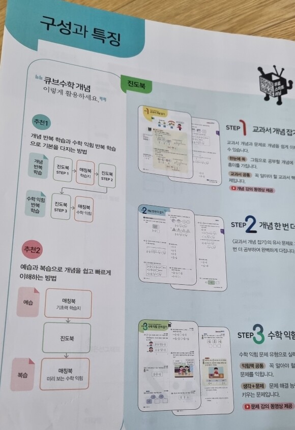 큐브 수학 개념 초등수학문제집은 교과서에 나오는 개념과 문제를 쉽게 이해할 수 있도록 해주고 문제를 한번 더 풀면서 개념을 또 다시 잡아줍니다. 다음으로 익힘 문제를 풀면서 실력을 다지는 구성으로 되어 있어요.