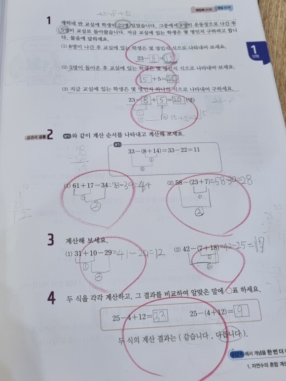 아이가 푼 문제들의 결과물이예요!~ 간혹 틀린 문제들도 있지만 틀린 부분은