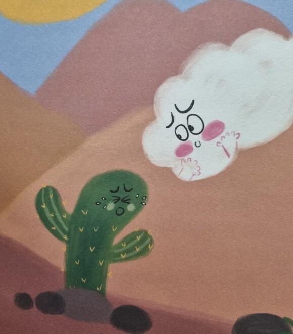 쓸린 별이는 모래언덕에 있는 축 쳐진 선인장을 만납니다.