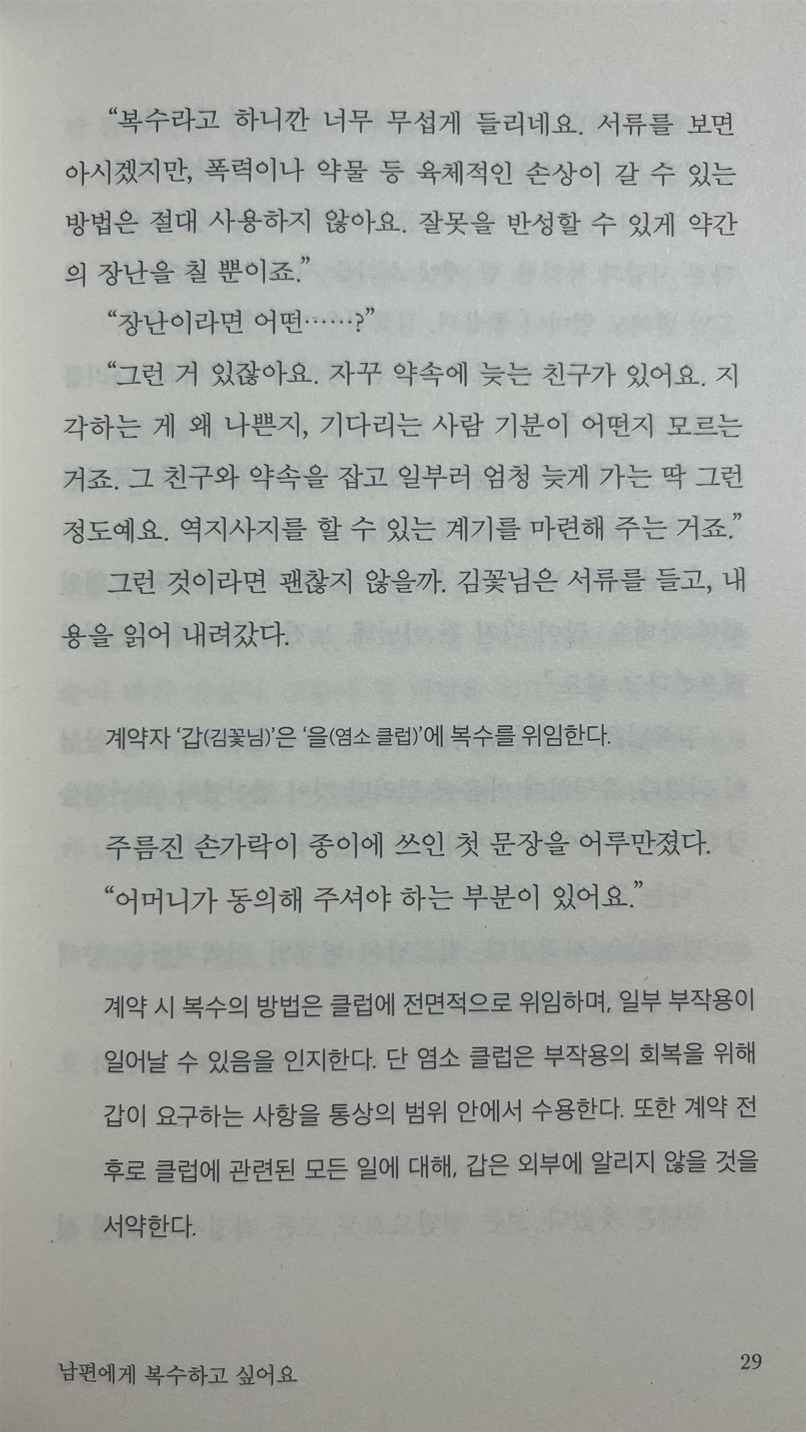 사랑과 복수가 한 번에 언급되는 것도 의아했고, 사랑을 하는 주체와 복수를 하는 주체가 달라 보여서 궁금했다. 그렇게 읽은 첫 에피소드에 나온 복수를 도와주는 ‘염소 클럽’ 그리고 각기 다른 이유로 자신만의 복수를 다짐하는 그들의 이야기에서 연결고리를 발견하게 된다.