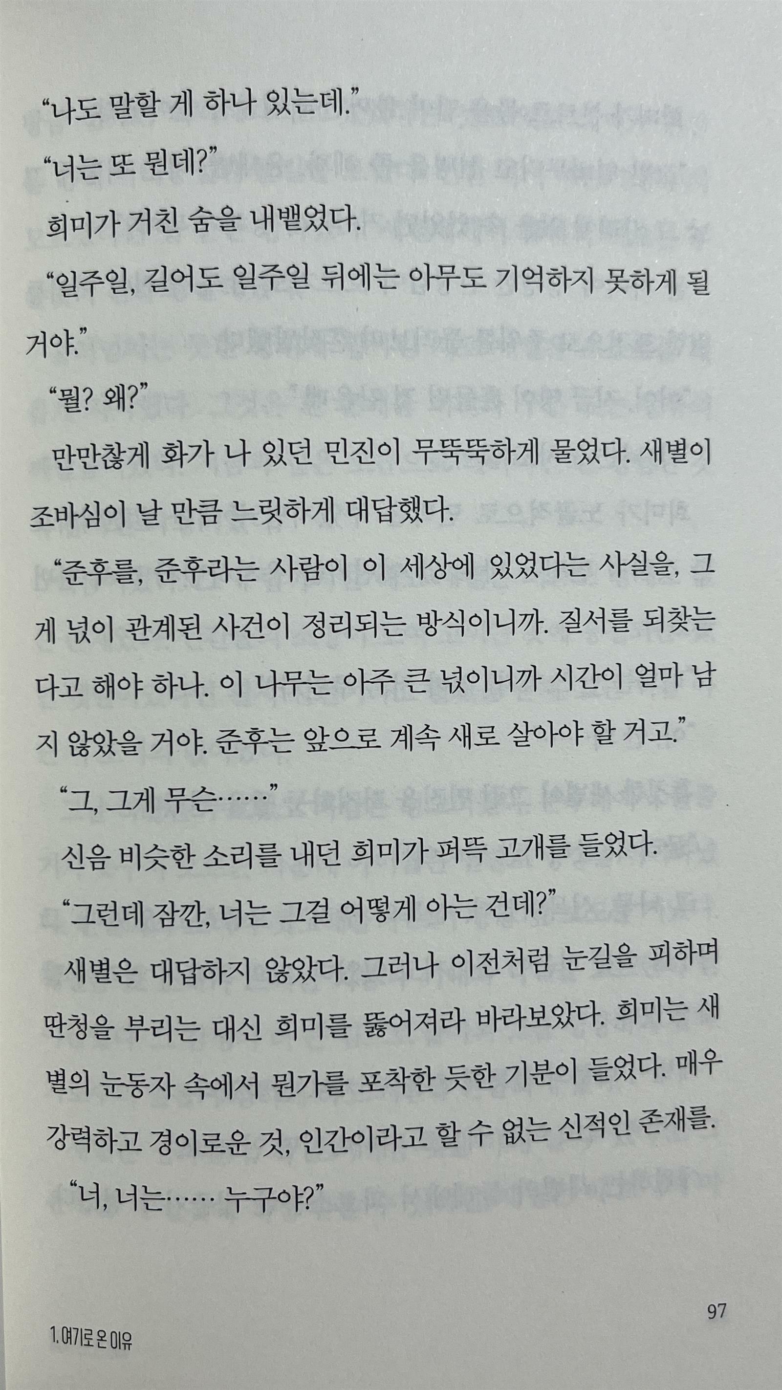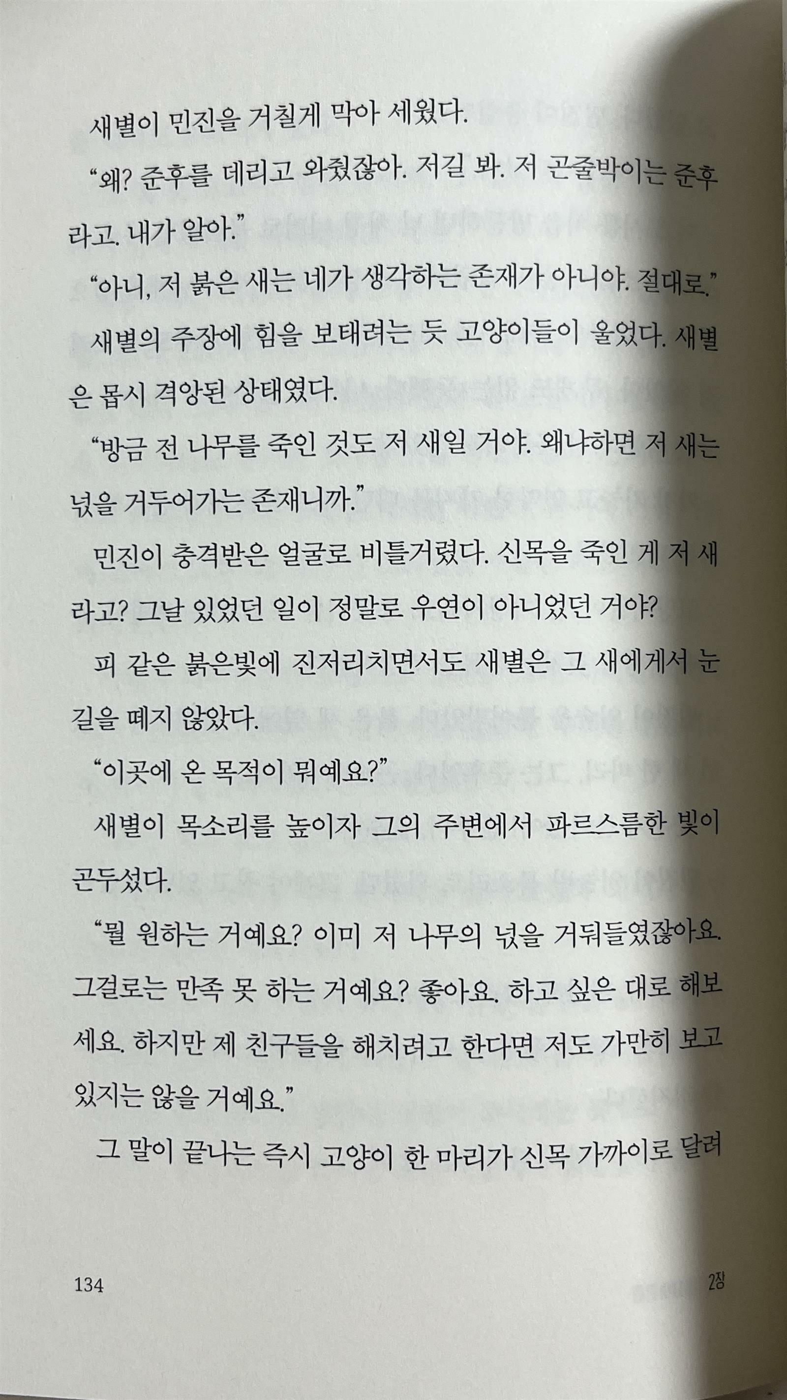하지만 민진은 전에도 그 새를 본 적이 있다. 이사 오기 전 민진은 갈대밭 위로 날아가는 큰 붉은 새를 보았다. 그리고 이사 후 도서관을 방문한 민진은 책등이 붉은 책에 이끌리게 된다. 스르륵 넘기다 멈춘 페이지에는 ‘새는 이승과 저승을 잇는 존재다’라고 적혀 있었다.