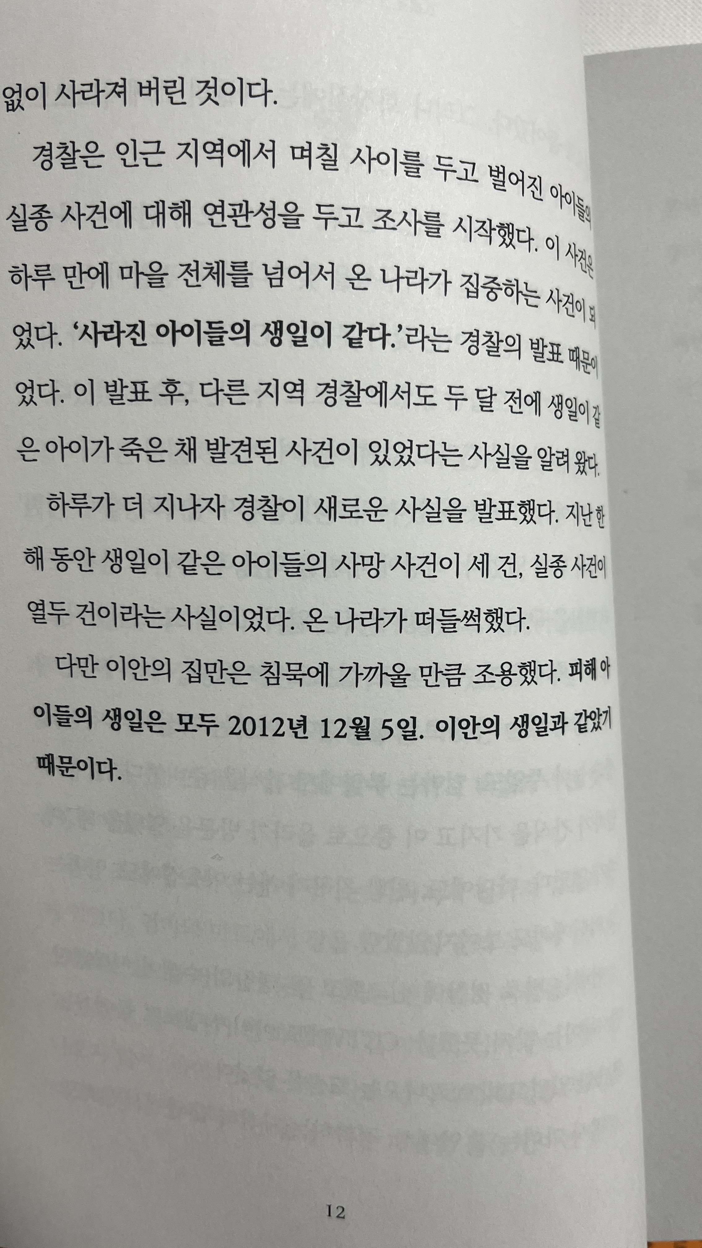 조용하던 마을에 어린이 실종 사건이 생긴다. 이웃 마을에서 또 어린이들이 실종됐다. 경찰이 발표한 기사에만 사망 사건이 3건, 실종 사건이 12건이었다. 실종된 아이들의 공통점은 생일이 같았다는 것. 그리고 주인공 이안의 생일 또한 그들과 같다는 것이다.