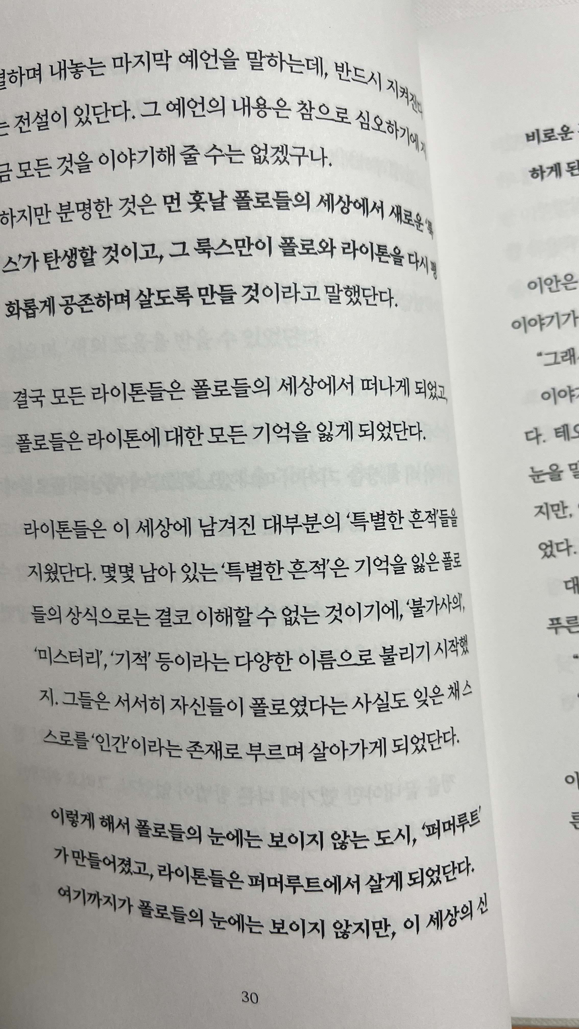 잠에서 덜 깬건지 기억을 잃은 건지 현실인지 꿈인지 분간안되는 상황 속에서 이안은 테오도라로부터 ‘예언 속 룩스’에 관한 이야기를 듣게 된다. 평범한 인간인 폴로. 그 중에 능력이 있는 폴로인 ‘라이톤’. 그들이 가진 특별한 능력은 다섯 가지의 신비로운 능력 때문이었다.