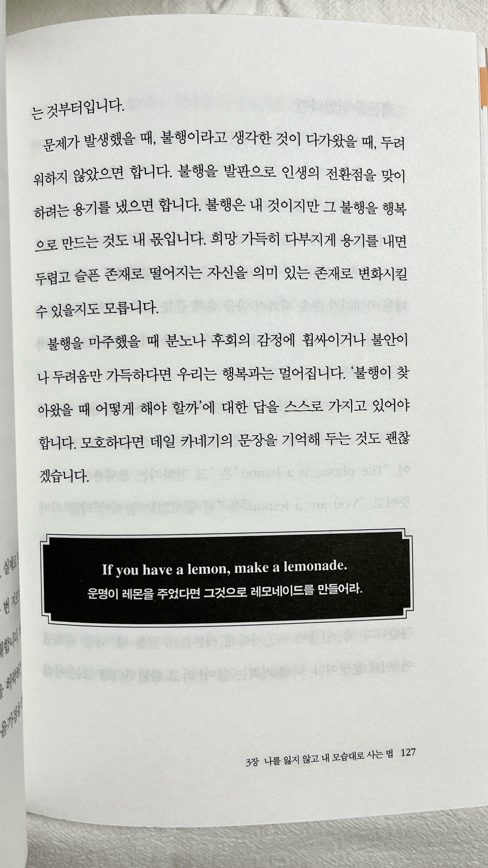 인간관계에 어려움을 겪고 있는 사람에게 데일 카네기는 말한다. 레몬이 있다면 그것으로 레모네이드를 만들어라는 말을 명심하라고. 이는 인간관계뿐만 아니라 처세술에도 능할 수 있는 방법이다. 그리고 데일 카네기 특유의 성공 대화론 화법이라는 생각이 들었다.