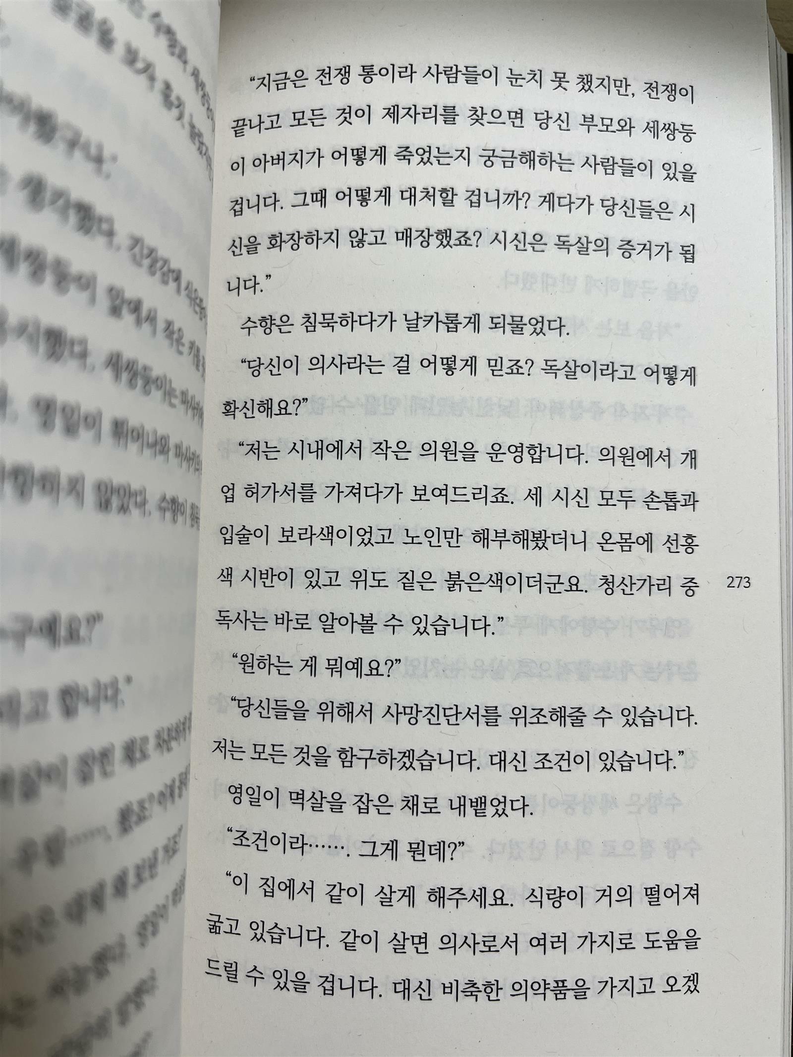 책을 읽는 내내 ‘내가 지금 읽고 있는 게 맞나?’ 생각이 들 때가 많았다. 내용에서 놀라고, 미친듯한 흡입력에 책을 손에서 놓을 수가 없었다.