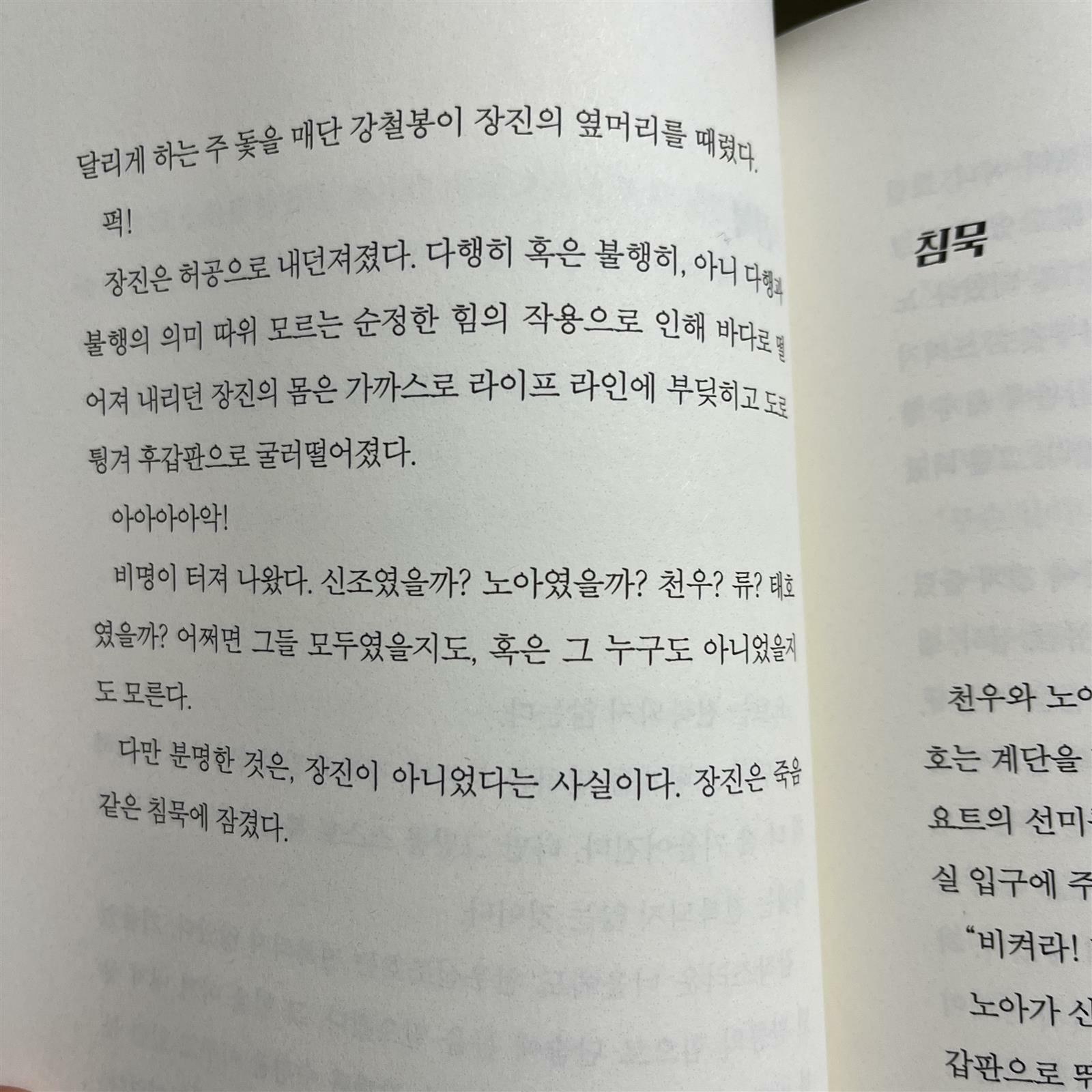 너울지는 바다를 아이들이 이겨낼 턱이 없었다. 요트가 왼편으로, 오른편으로 크게 기울 때마다 아이들은 속수무책으로 몸을 가눌 수 없었다. 그때까지는 괜찮았다. 하지만 요트가 급격히 기울어진 순간 사고가 났다.