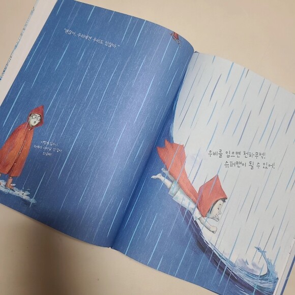 아빠의 말에 아이는 비가많이 와서 우산으로 안되면 우비를 입으면 되고,