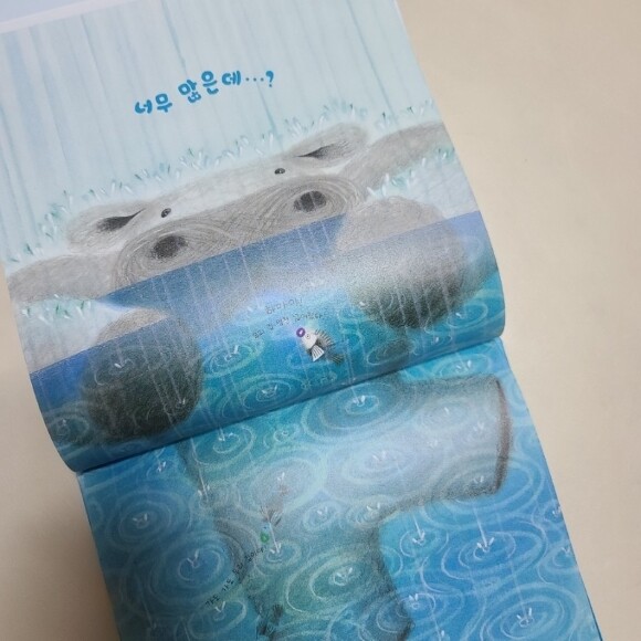 그런데 갑자기 빗방울이 떨어지더니 금세 아기 하마 코밑까지 물이 차올랐어요.