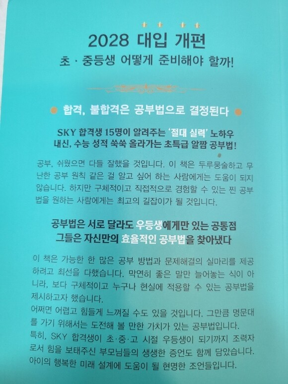 다가오는 2028 대입 개편 초. 중등생이 어떻게 준비해야 할지 잘 나와있어요. 15명의 SKY 합격생의 공부법도 함께 살펴보면서, 내 아이 만의 효율적인 공부 방법을 찾아낸다면, 그리고 꾸준히 흔들리지 않고 학습한다면 좋은 결과가 있으리라 믿습니다.