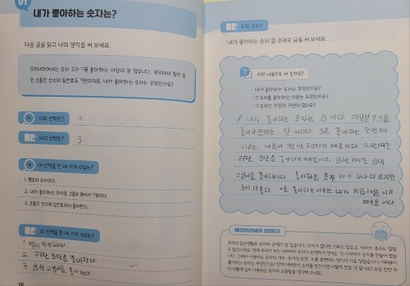이렇게 글쓰기를 완성 했어요. 아이다운 글이죠? 글이 좀 집중이 안되는 느낌이지만, 50가지의 질문으로 꾸준히 쓰다보면 좀 더 논리적으로 정리할 수 있을 것 같아요. 이렇게 첫날 부터 2가지의 글쓰기를 완성했답니다. 처음엔 막막했지만, 예시와 해피이선생의 한마디! 라는 조언으로 글쓰기에 한발 더 다가갈 수 있었어요.