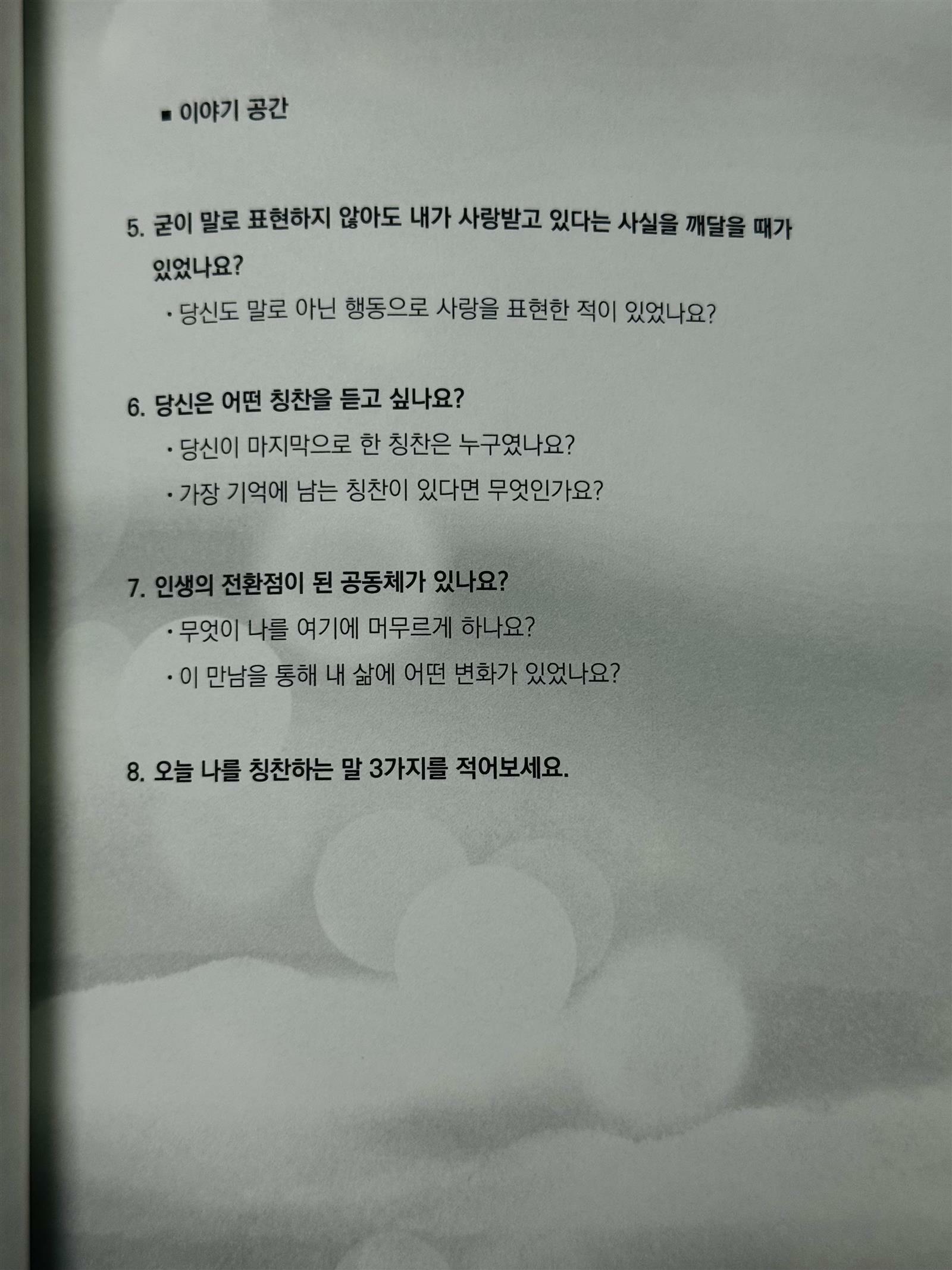 이 책 자체가 독서모임을 통해 질문에 맞춰 자신의 이야기를 하며 치유에 이를 수 있도록 기획 되었다는 생각에