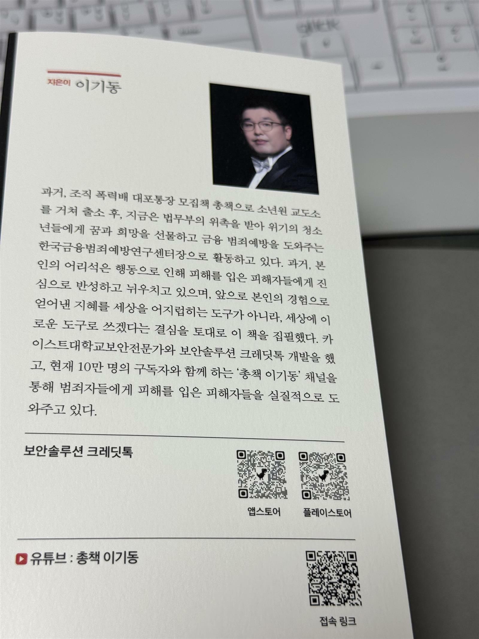 저자 이기동 씨는 과거 대포통장 모집 총책으로 일했던 경력을 가지고 있습니다. 자신의 과거를 반성하고, 더 이상의 피해자가 생기지 않도록 이 책을 집필했다고 합니다. 현재는 악성앱 검사 및 보안 강화 앱 '크레딧톡'을 개발하며 범죄 예방 활동을 하고 계십니다.