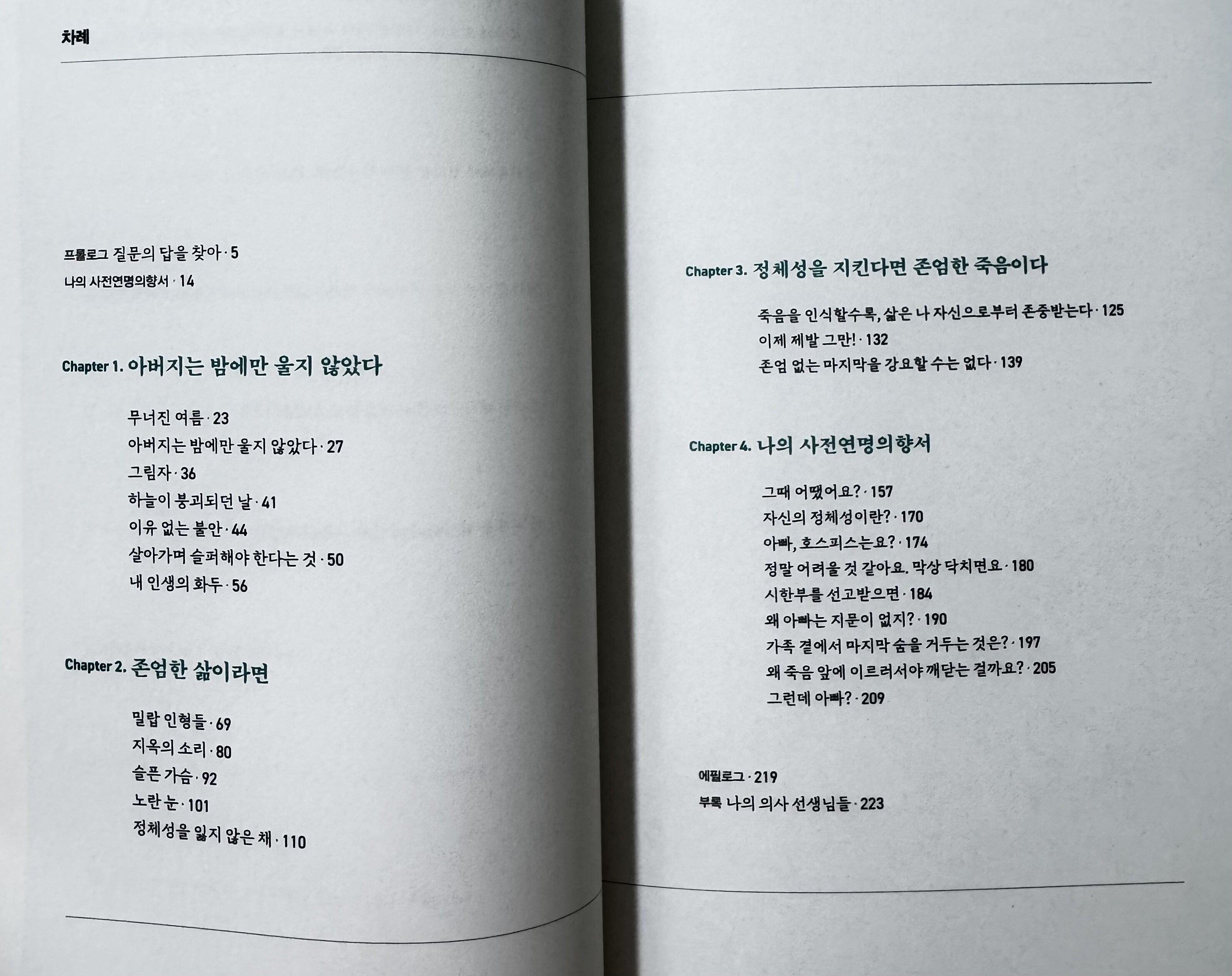 4장은 아버지와의 대화를 통해 존엄한 삶과 죽음이란 무엇인지를 깨닫는 과정이 적혀있습니다.