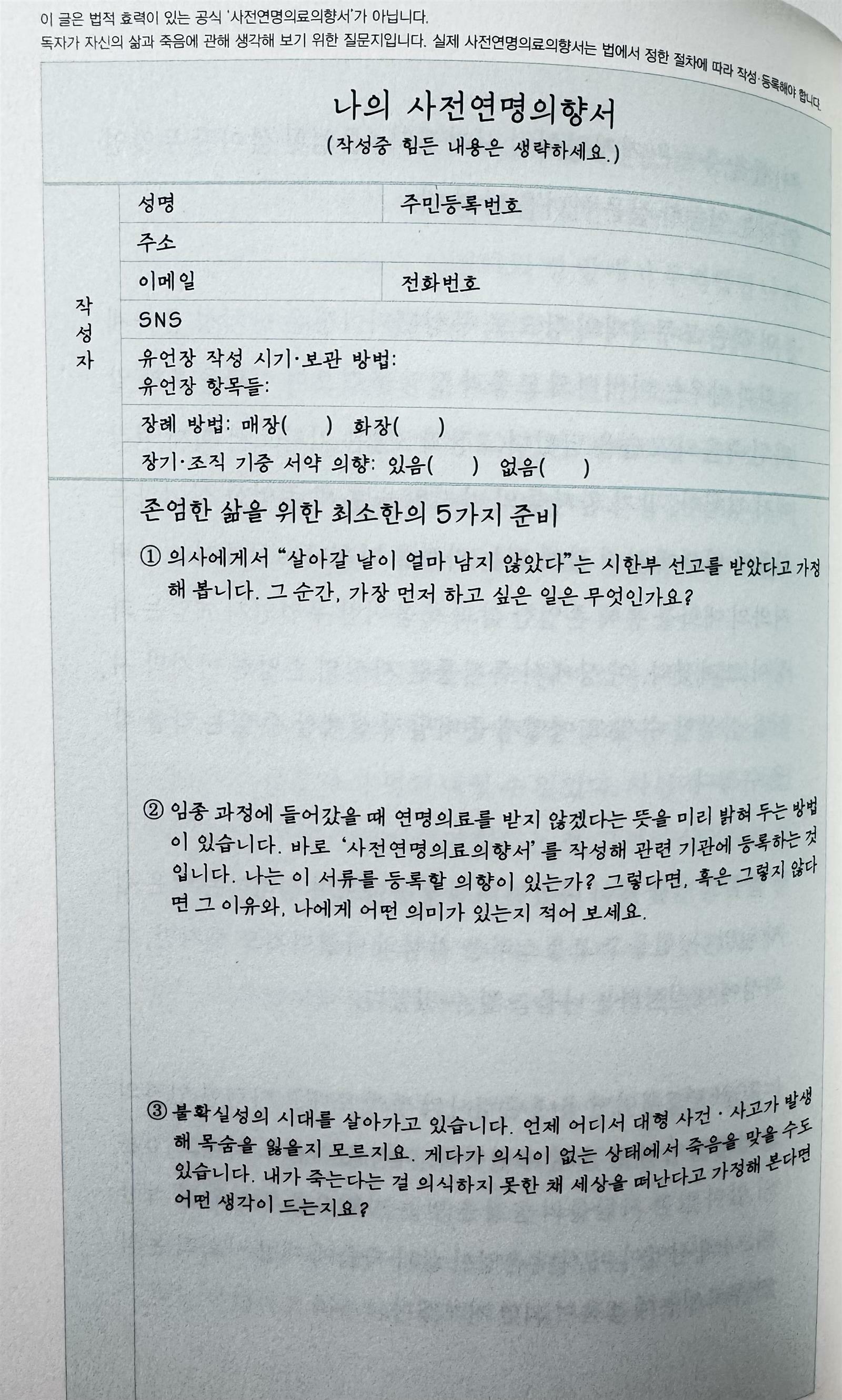 마지막으로 저자가 제시한 '나의 사전연명의향서'의 질문에 답하며 리뷰를 마무리 합니다.