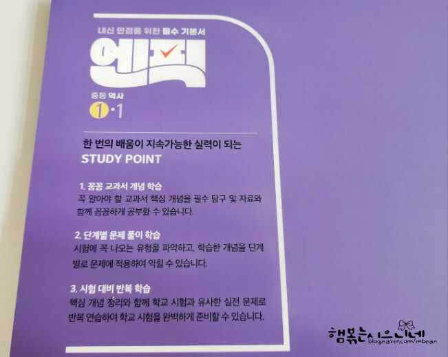 역사의 의미를 다시 되짚어 보고 초등역사보다 중등역사는 조금더 심도있게 들어가고 엔픽역사에서는 조금더 흥미롭고 재미있게 접근할수 있도록 문제집을 만들었답니다.