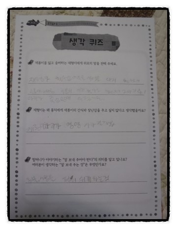 이 책을 읽고 아이들이 남의 의견도 잘 존중해주고 자기의 의견도 잘 말할 수 있는 아이들이 되었으면 좋겠다는 생각이 들었습니다. ㅎㅎ
