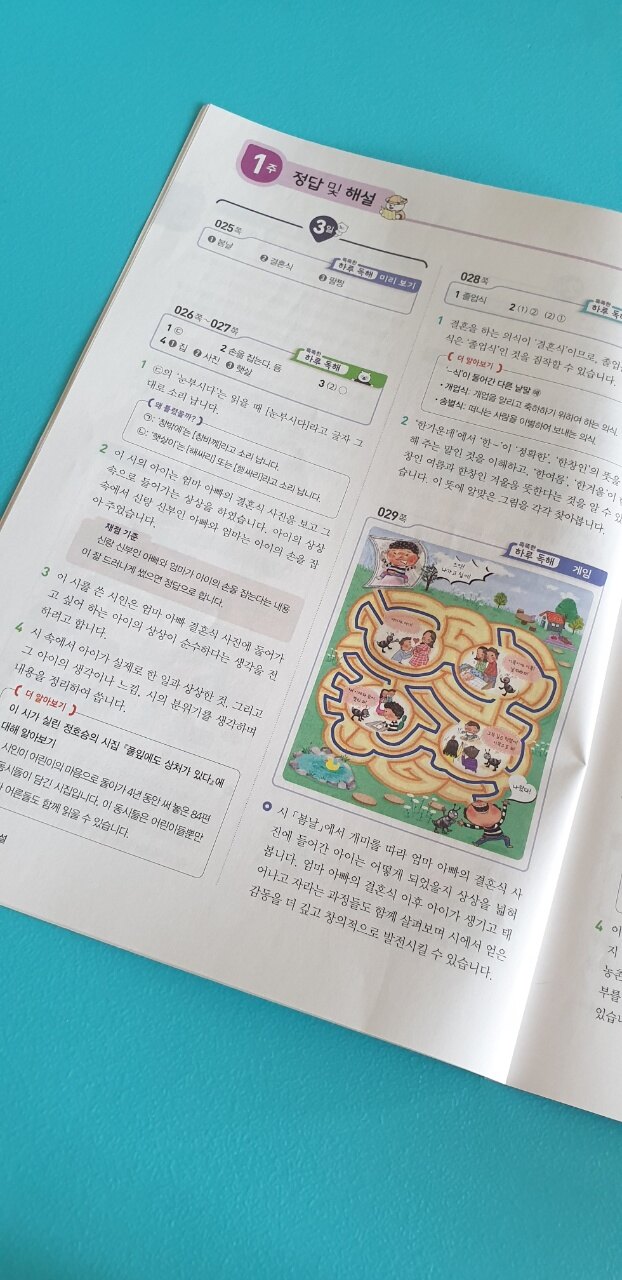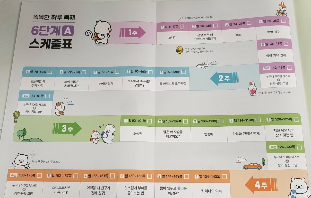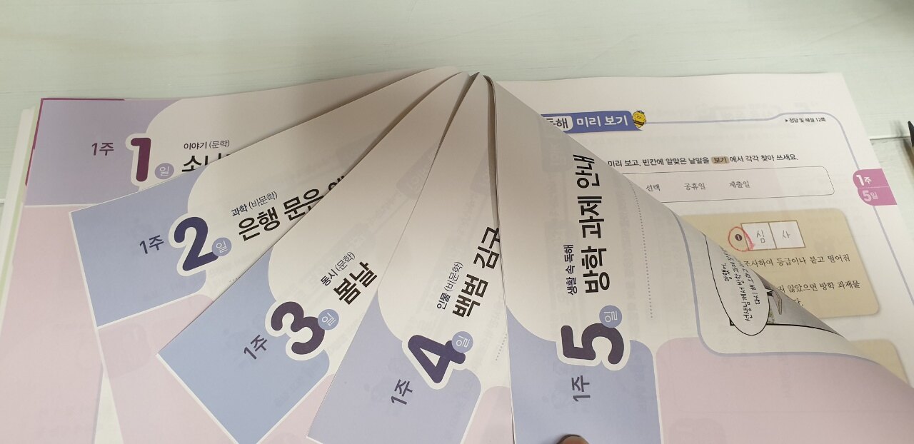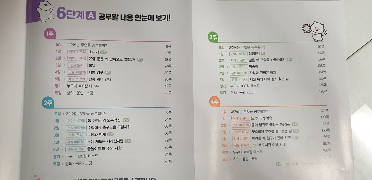 4주에 걸쳐 다양한 지문(문학/비문학/생활 속 독해)을 공부하는데 초5-6학년용 단계에 걸맞게 중학교 수준의 지문도 수록이 되어 있어 독해 확장에 도움이 될 거 같아요